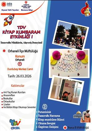 26 Mart Perşembe günü saat 11:00 ile 17:00 arasında Durdubey Merkez Camii avlusunda "TDV KİTAP KUMBARAM ETKİNLİĞİ" çerçevesinde mini kitap fuarı yapılacaktır.