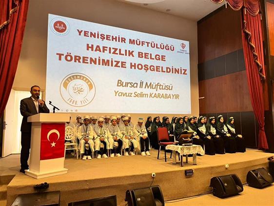 Yenişehir İlçe Müftülüğü öncülüğünde Seyit Emir Sultan Kur’an Kursu ve Yenişehir Kız Kur’an Kursu’ndan mezun olan 42 öğrencimiz için görkemli bir hafızlık merasimi düzenlendi. Programa halkın yoğun ilgisi, törene ayrı bir manevi derinlik kattı.